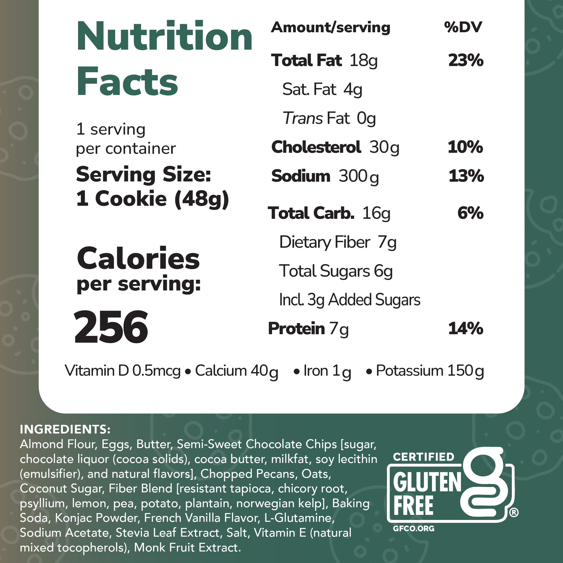 All of our cookies have 1-4 grams net carbs depending on the flavor while our bites are 1 gram net carb each. To calculate net carbs, subtract fiber and allulose from total carbs. Example: 1 cup of broccoli has 6g carbs and 2.4g fiber = 3.6 net carbs. Recommended net carbs on keto: 20g or less/day.