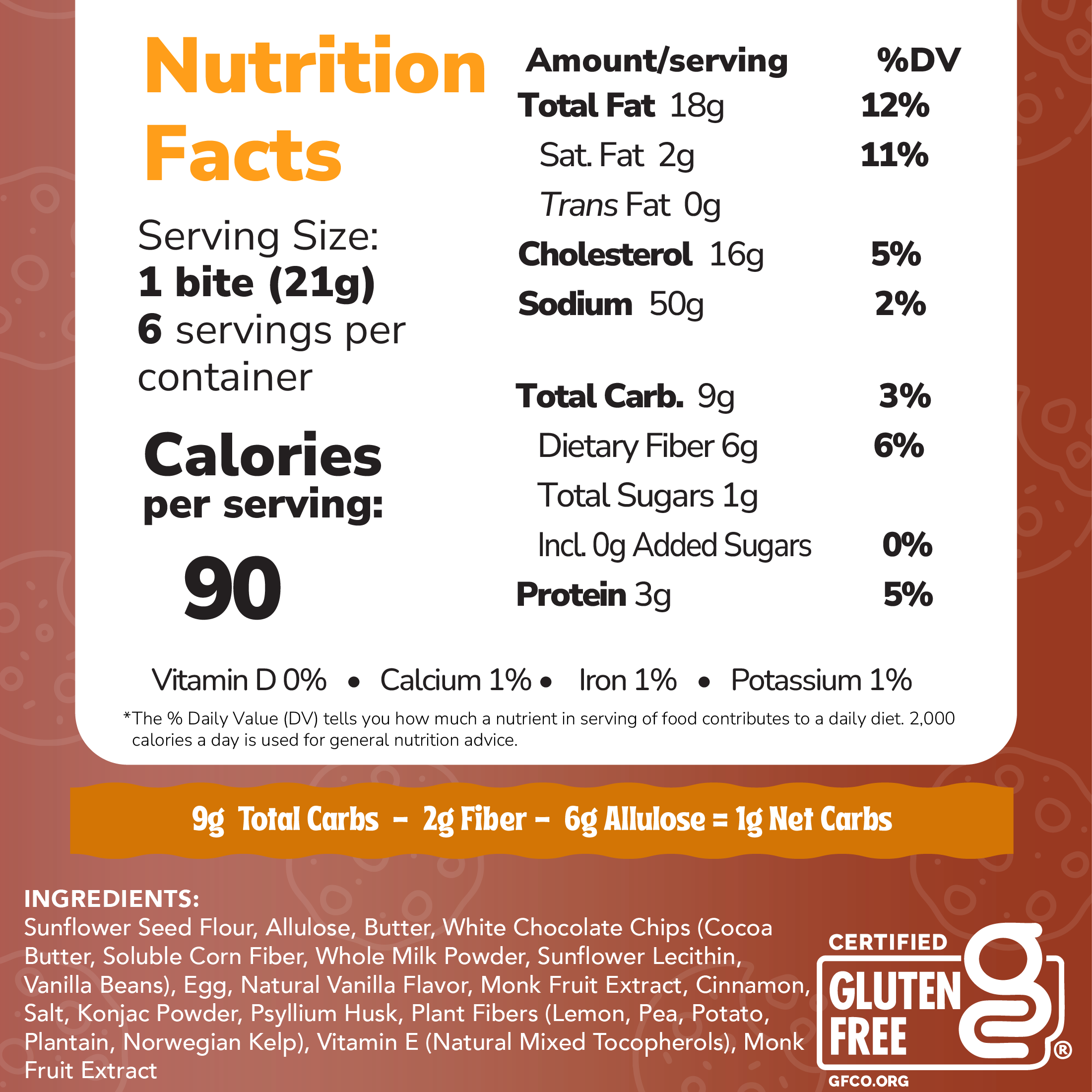 All of our cookies have 1-4 grams net carbs depending on the flavor while our bites are 1 gram net carb each. To calculate net carbs, subtract fiber and allulose from total carbs. Example: 1 cup of broccoli has 6g carbs and 2.4g fiber = 3.6 net carbs. Recommended net carbs on keto: 20g or less/day.