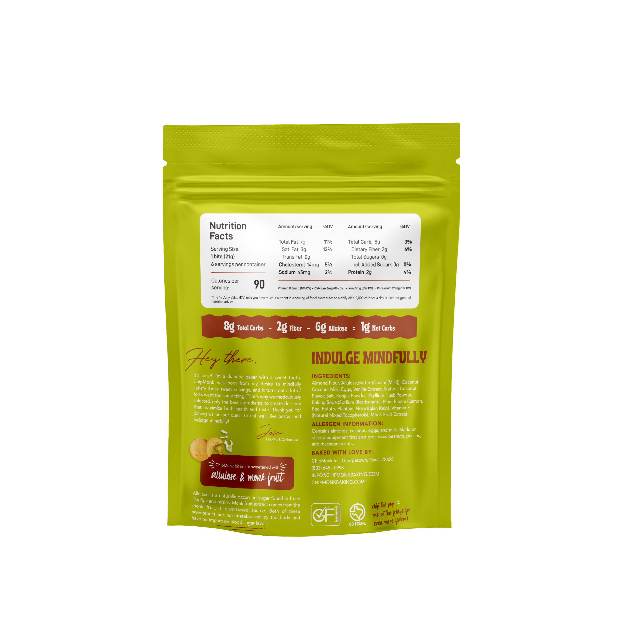All of our cookies have 1-4 grams net carbs depending on the flavor while our bites are 1 gram net carb each. To calculate net carbs, subtract fiber and allulose from total carbs. Example: 1 cup of broccoli has 6g carbs and 2.4g fiber = 3.6 net carbs. Recommended net carbs on keto: 20g or less/day.