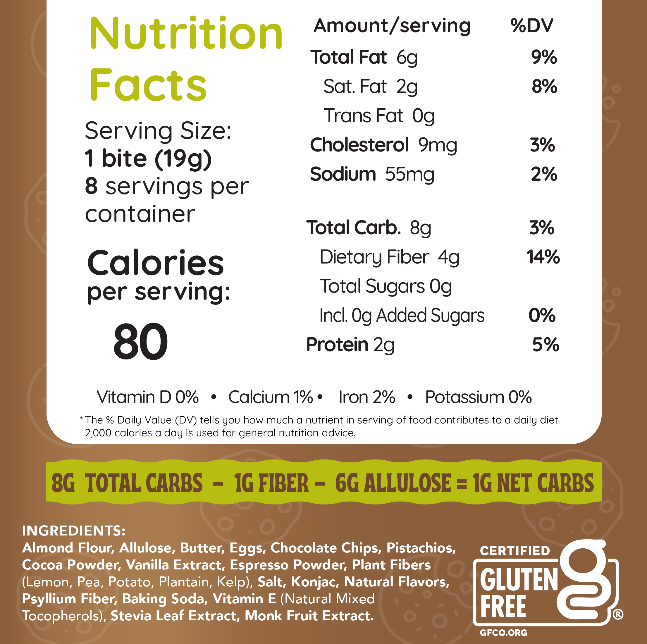 All of our cookies have 1-4 grams net carbs depending on the flavor while our bites are 1 gram net carb each. To calculate net carbs, subtract fiber and allulose from total carbs. Example: 1 cup of broccoli has 6g carbs and 2.4g fiber = 3.6 net carbs. Recommended net carbs on keto: 20g or less/day.