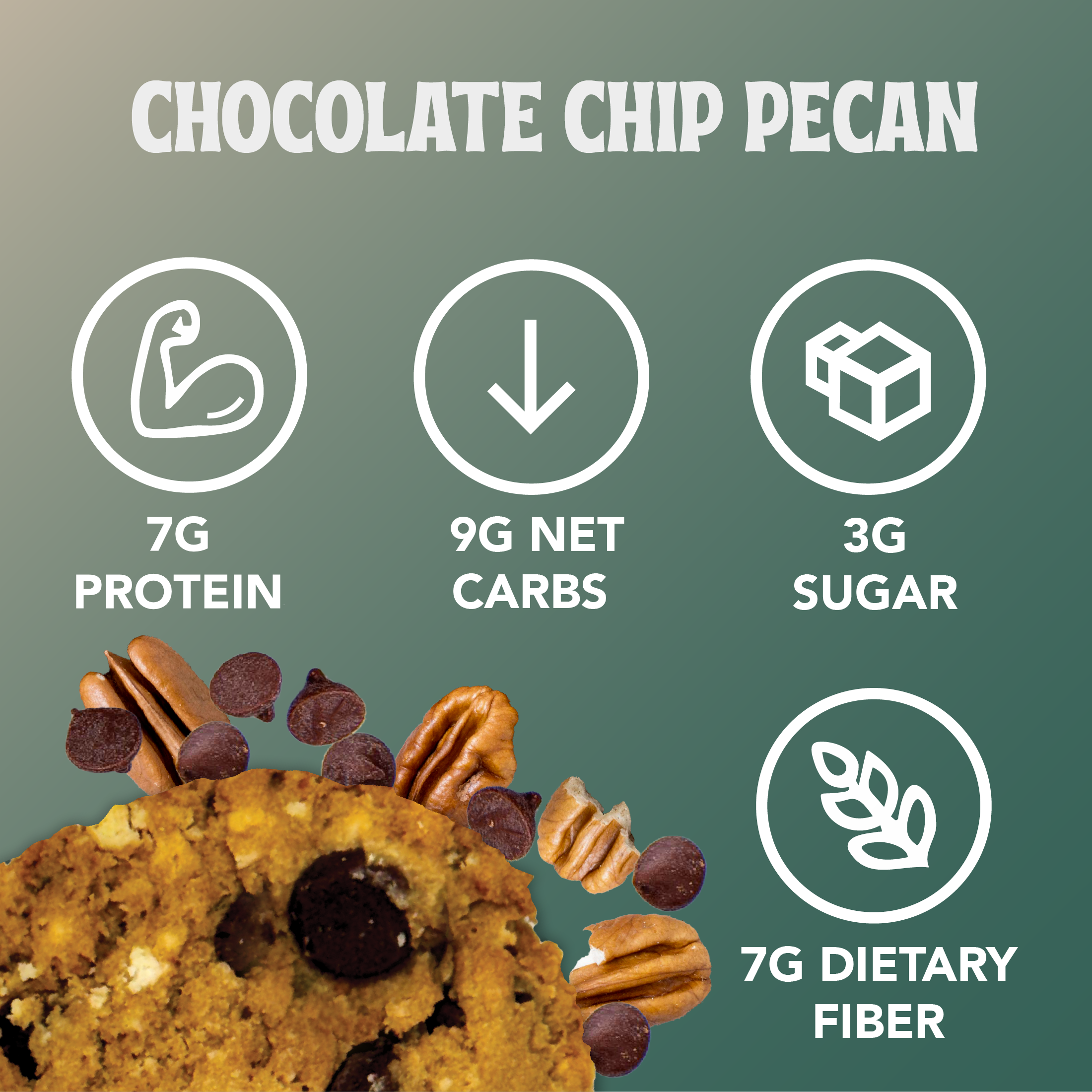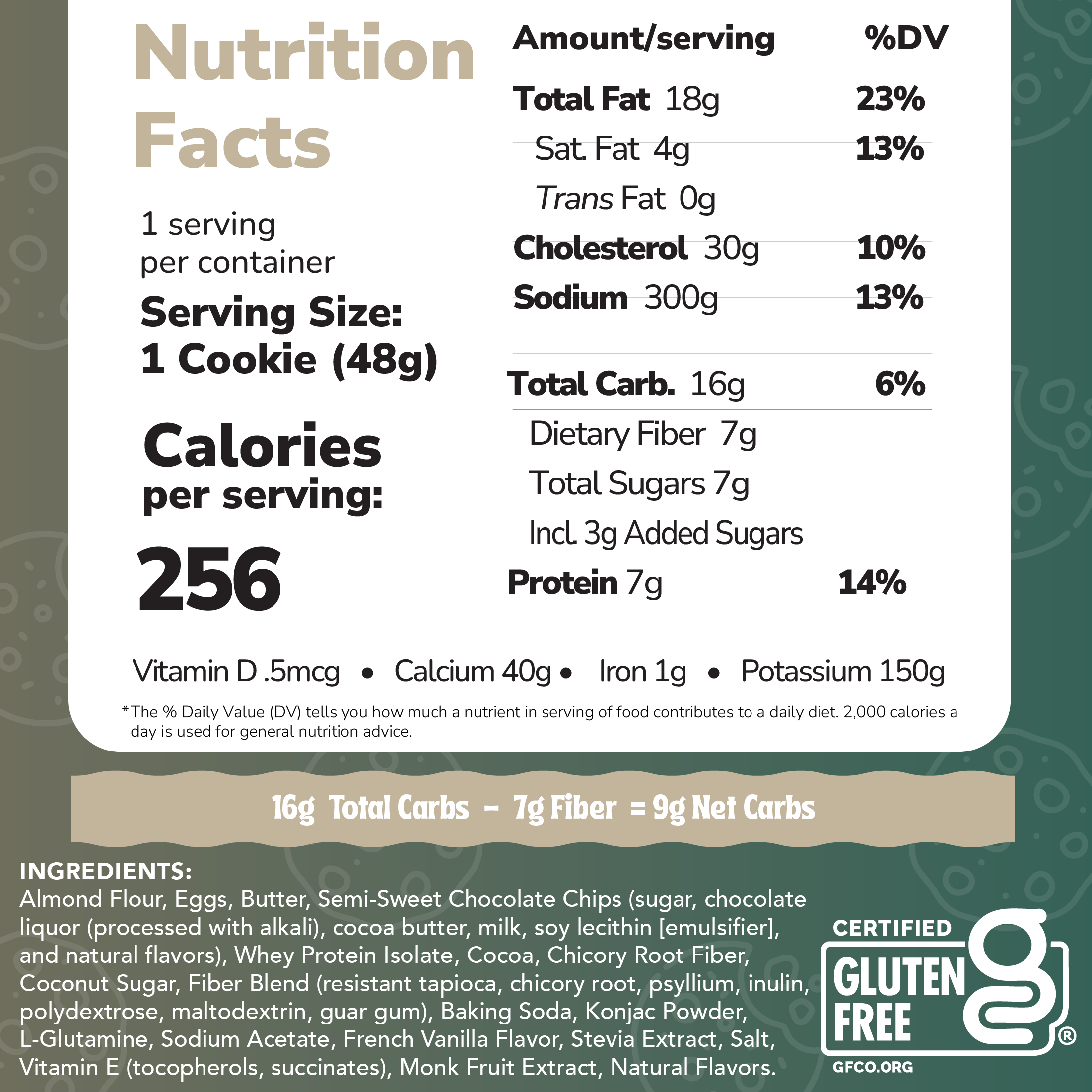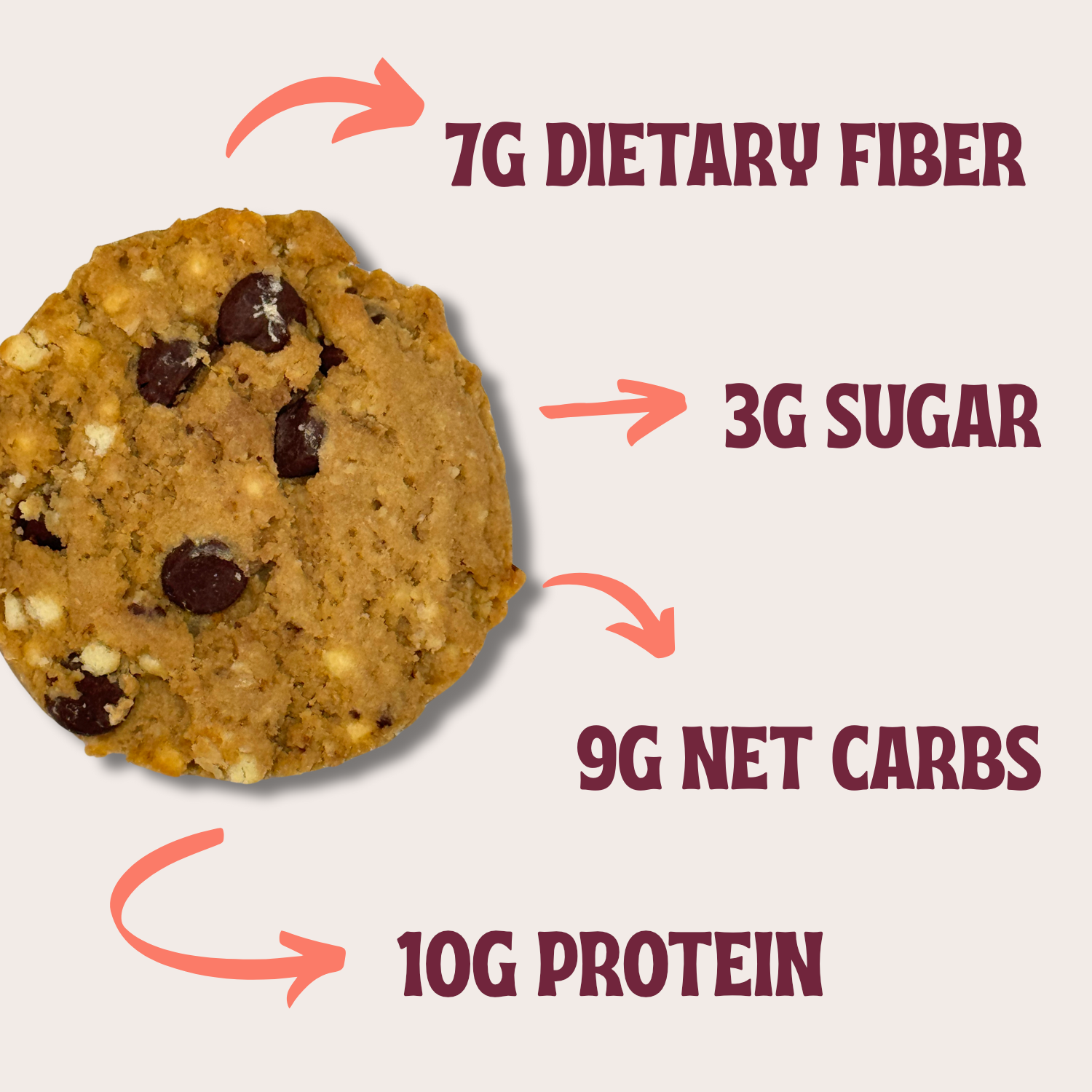 All of our cookies have 1-4 grams net carbs depending on the flavor while our bites are 1 gram net carb each. To calculate net carbs, subtract fiber and allulose from total carbs. Example: 1 cup of broccoli has 6g carbs and 2.4g fiber = 3.6 net carbs. Recommended net carbs on keto: 20g or less/day.