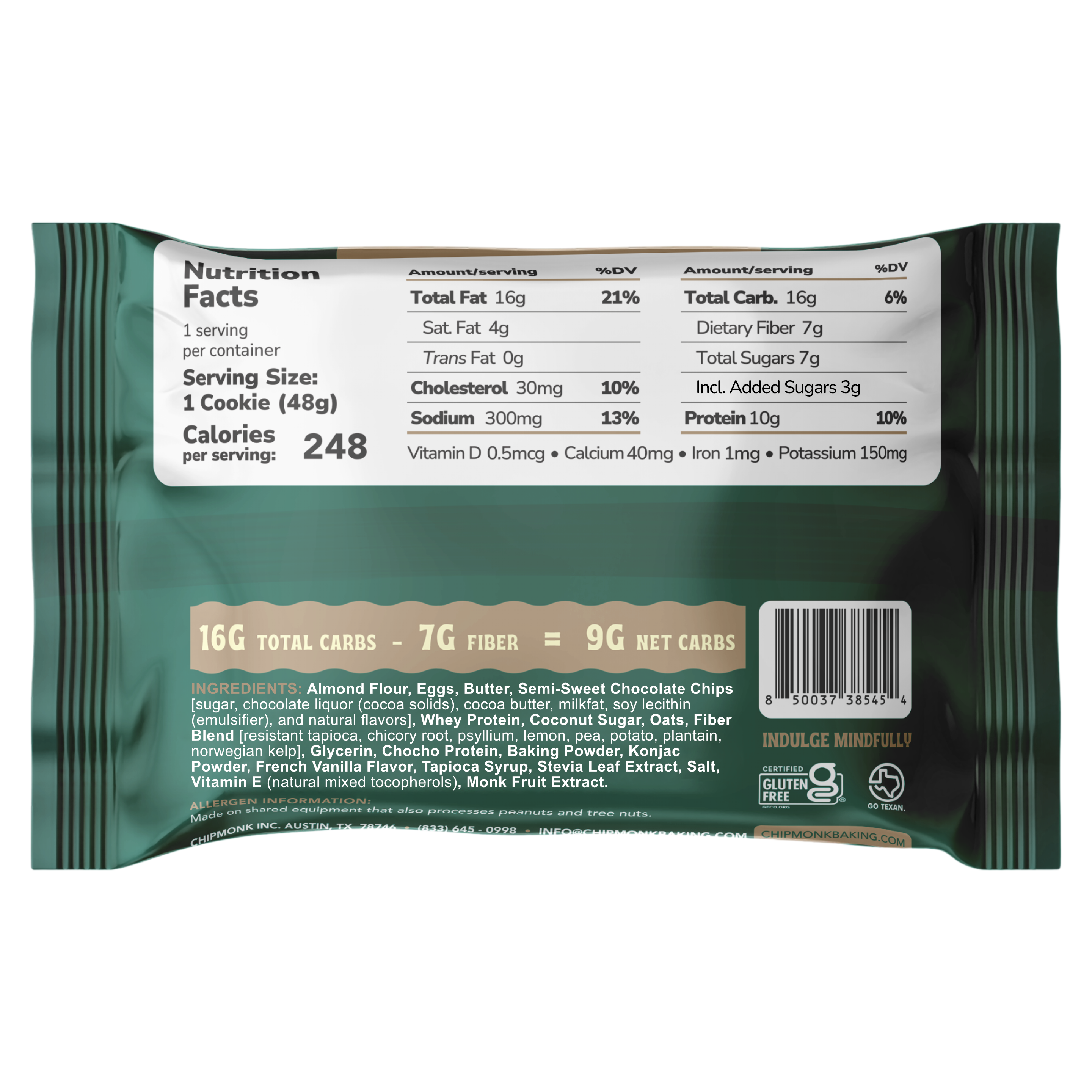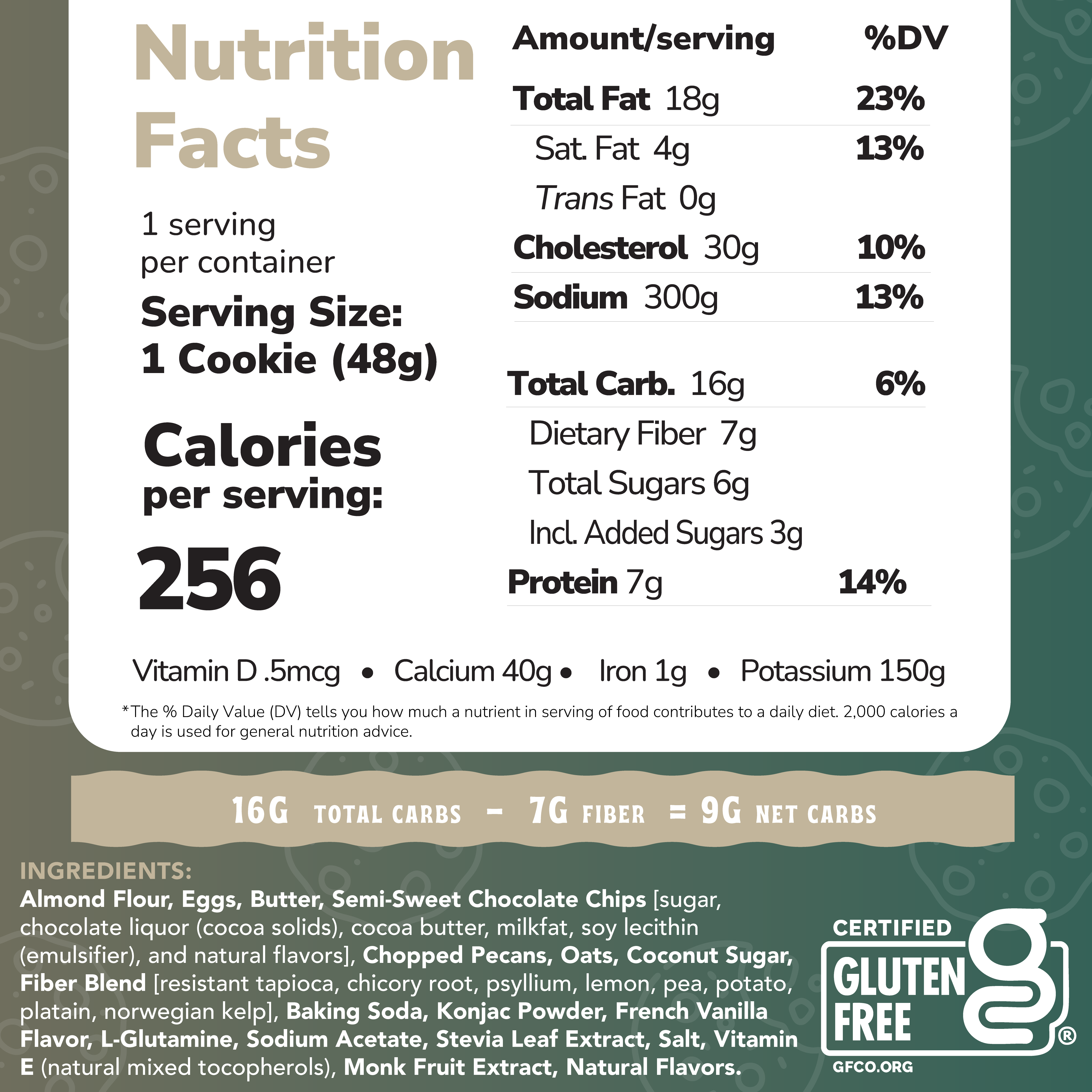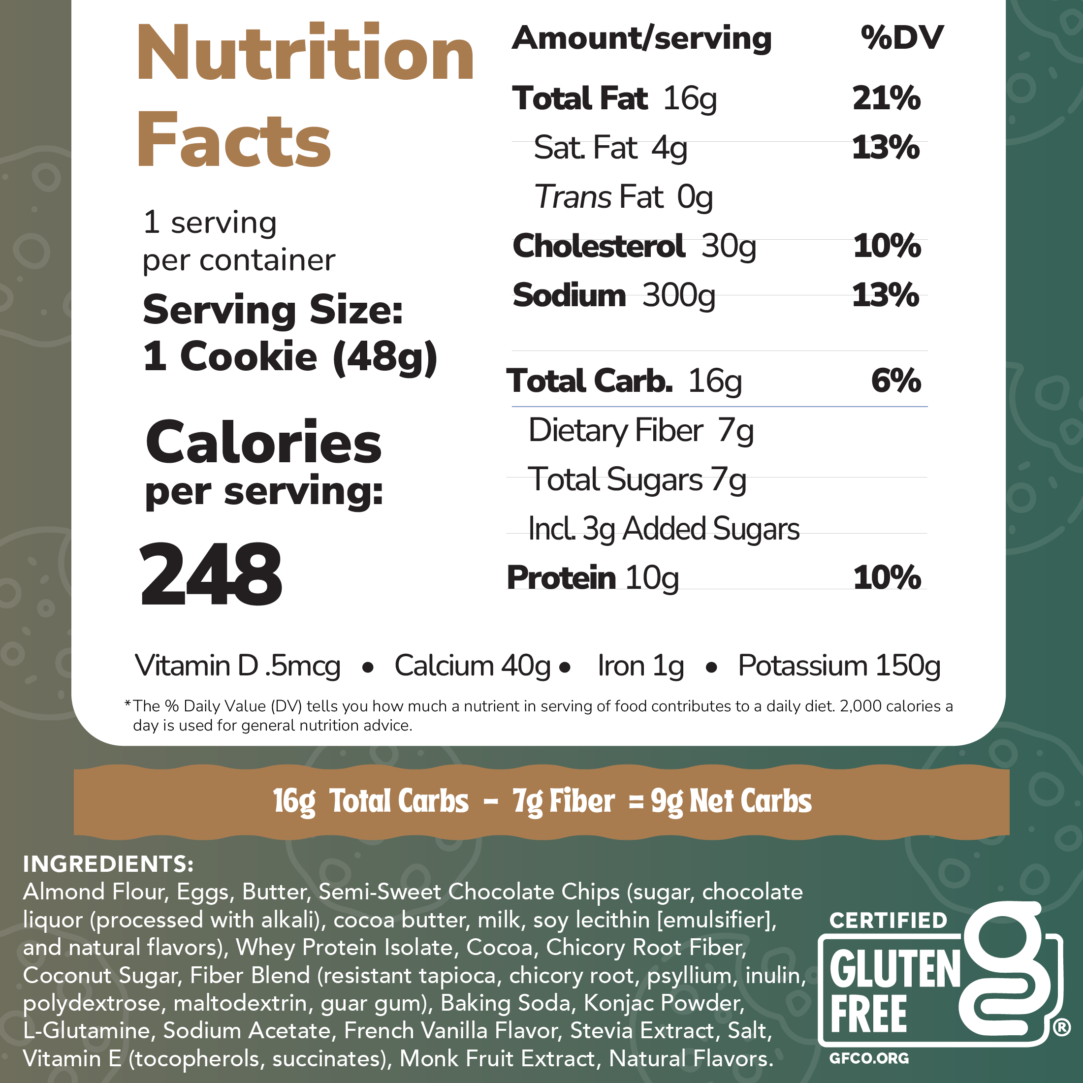 All of our cookies have 1-4 grams net carbs depending on the flavor while our bites are 1 gram net carb each. To calculate net carbs, subtract fiber and allulose from total carbs. Example: 1 cup of broccoli has 6g carbs and 2.4g fiber = 3.6 net carbs. Recommended net carbs on keto: 20g or less/day.