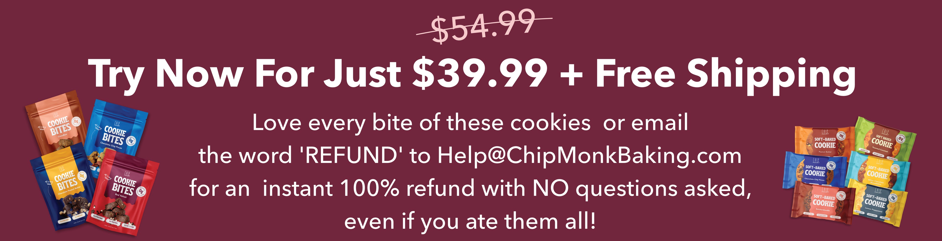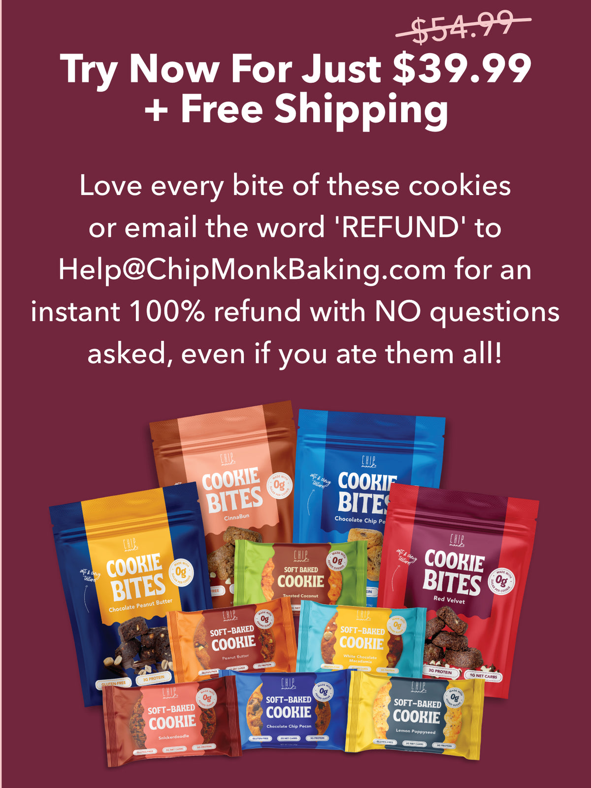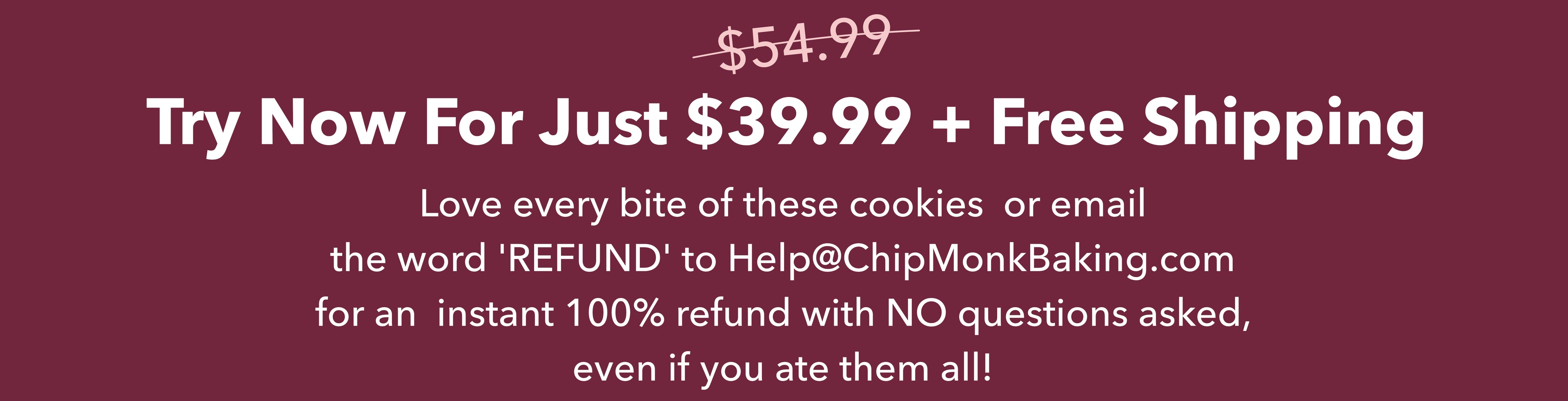 We are confident you will love our products as much as we do! However, if your order doesn’t meet your standards for any reason, please email us at info@chipmonkbaking.com, and we'll be happy to refund you.