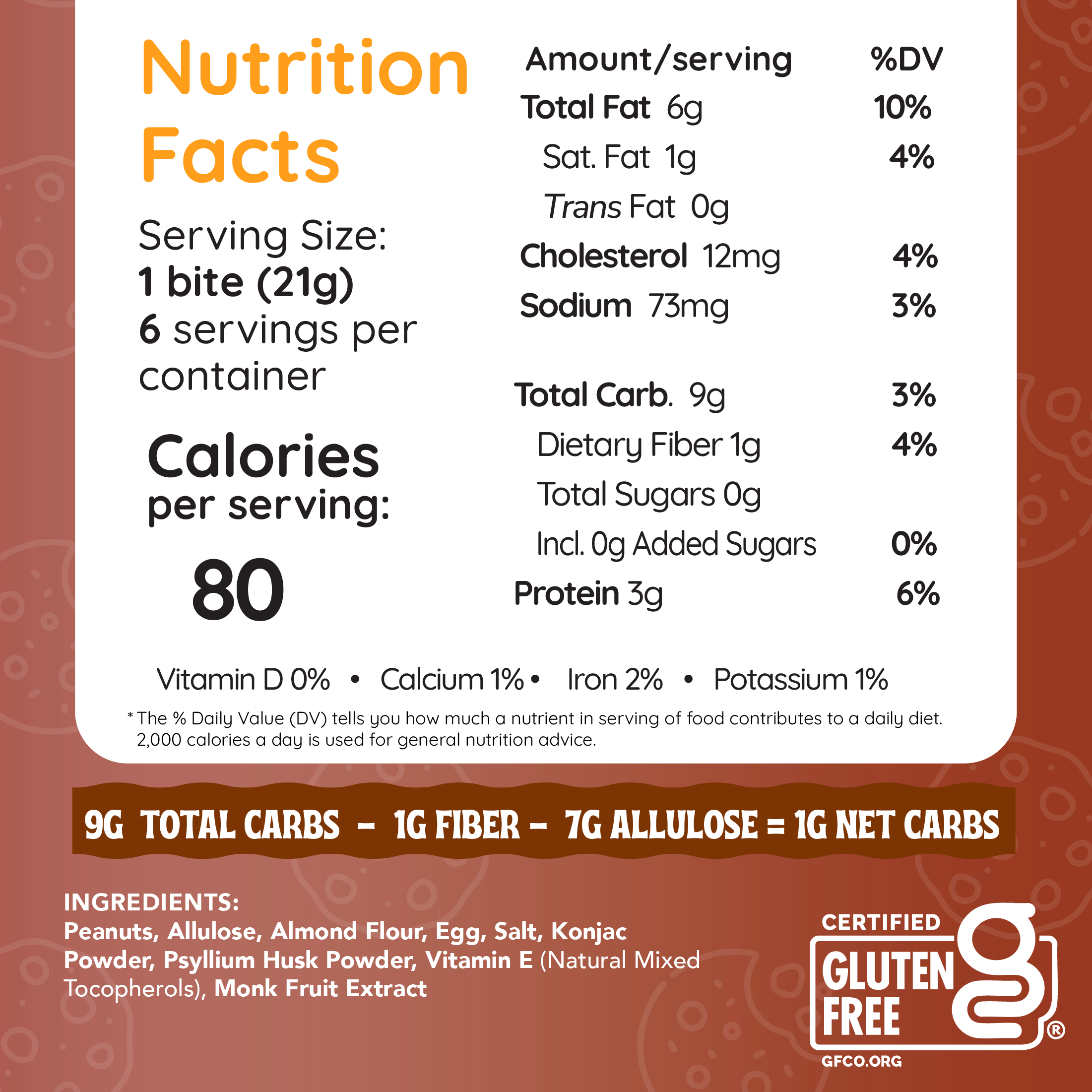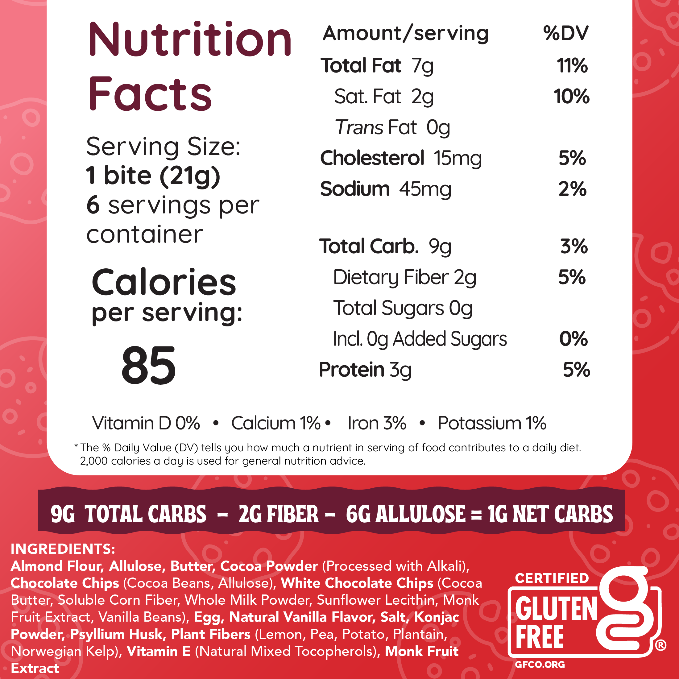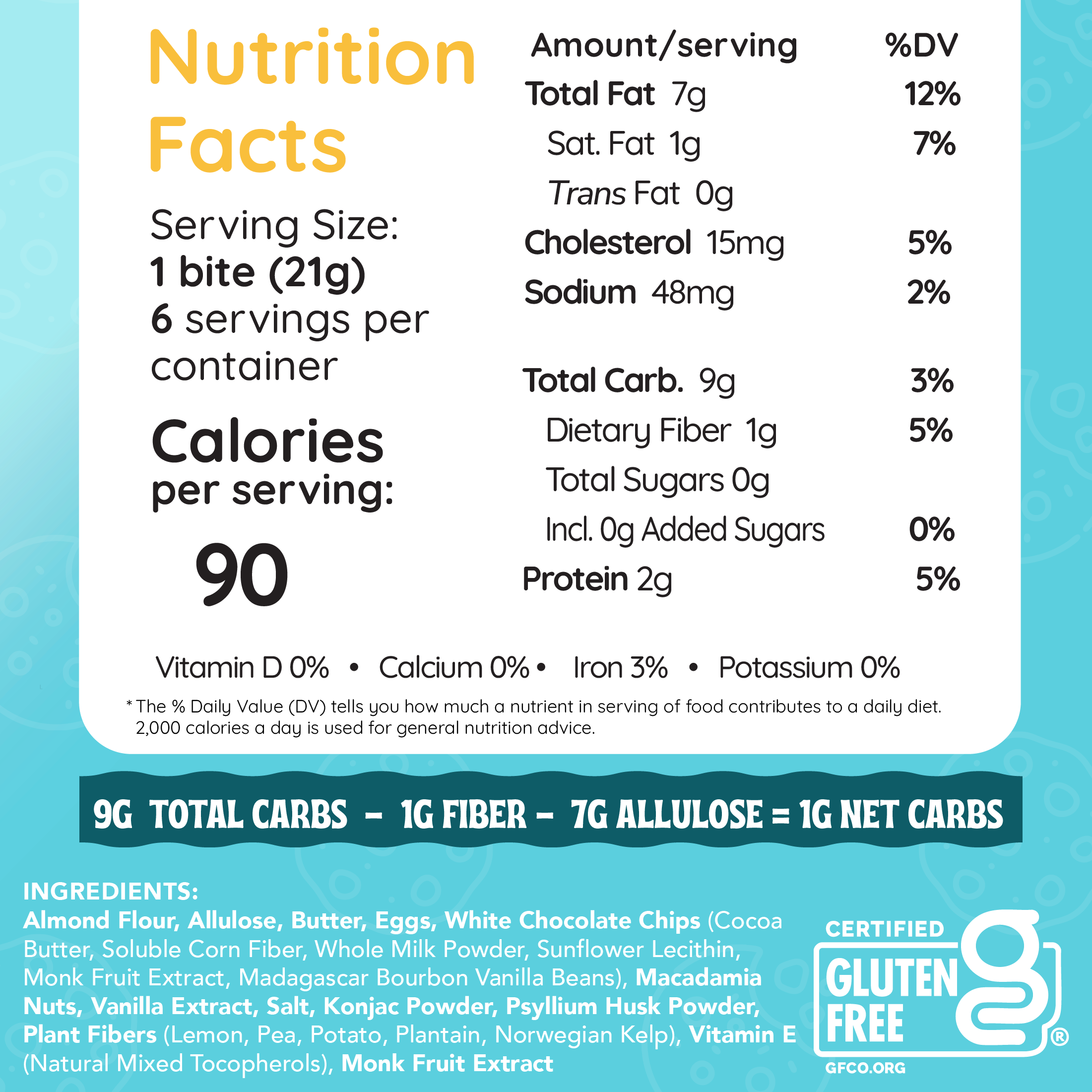 All of our cookies have 1-4 grams net carbs depending on the flavor while our bites are 1 gram net carb each. To calculate net carbs, subtract fiber and allulose from total carbs. Example: 1 cup of broccoli has 6g carbs and 2.4g fiber = 3.6 net carbs. Recommended net carbs on keto: 20g or less/day.