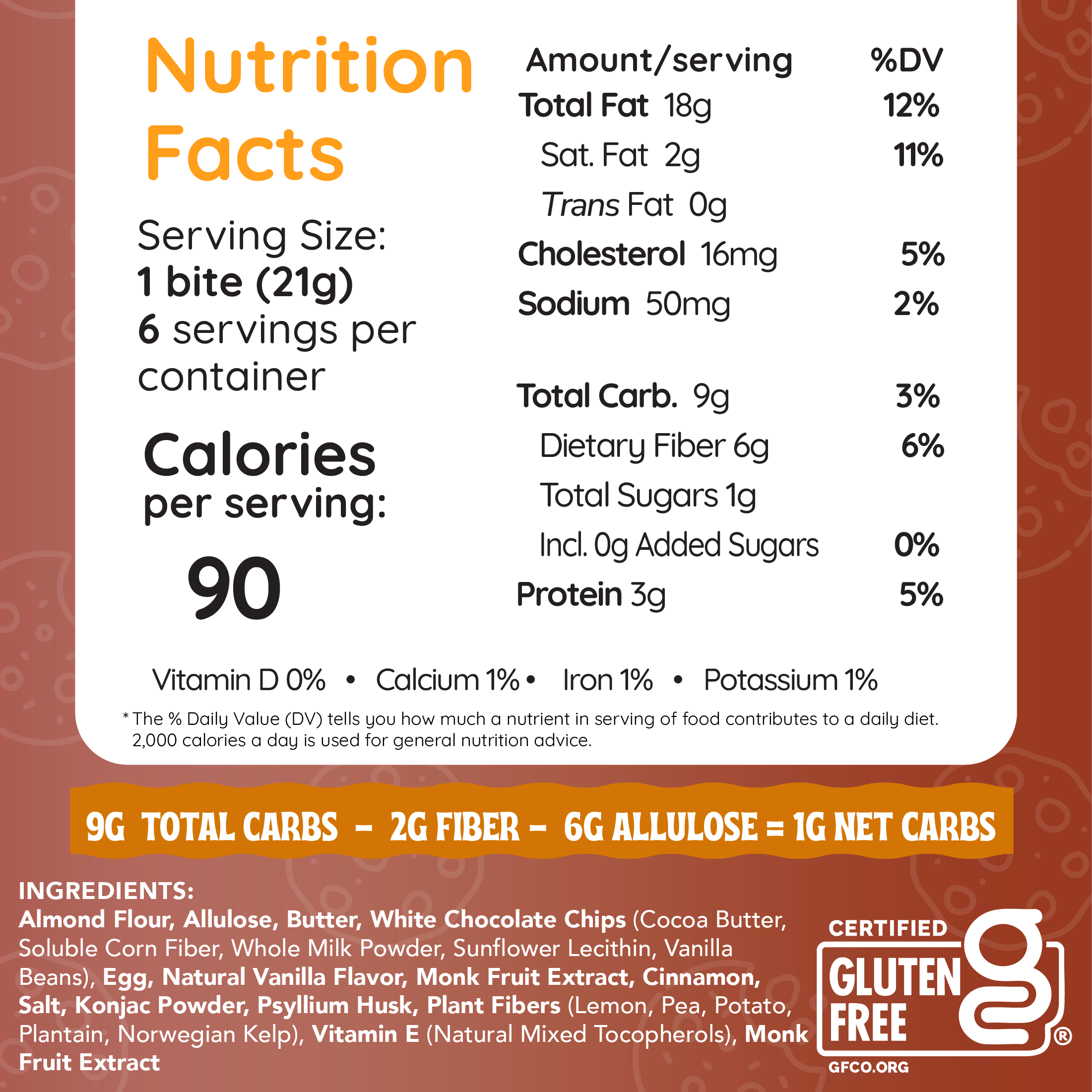 We use Allulose and Monk Fruit sweetener to give our cookie bites a delicious taste, similar to regular table sugar. Allulose is a natural rare sugar which is not metabolized by the body and has no glycemic impact. Monk fruit extract is a natural, plant-based extract which is not metabolized by the body and has no glycemic impact.