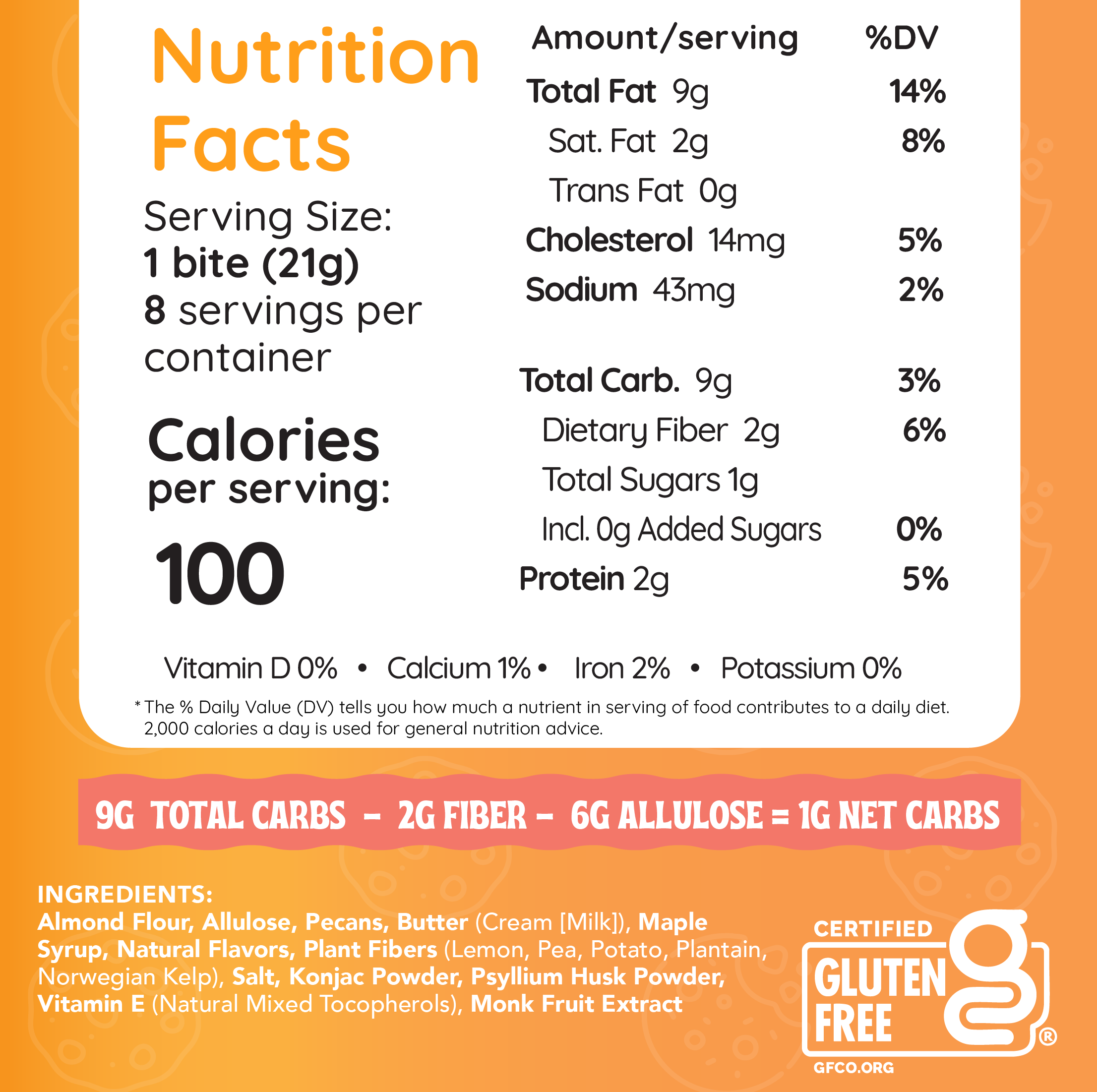 All of our cookies have 1-4 grams net carbs depending on the flavor while our bites are 1 gram net carb each. To calculate net carbs, subtract fiber and allulose from total carbs. Example: 1 cup of broccoli has 6g carbs and 2.4g fiber = 3.6 net carbs. Recommended net carbs on keto: 20g or less/day.