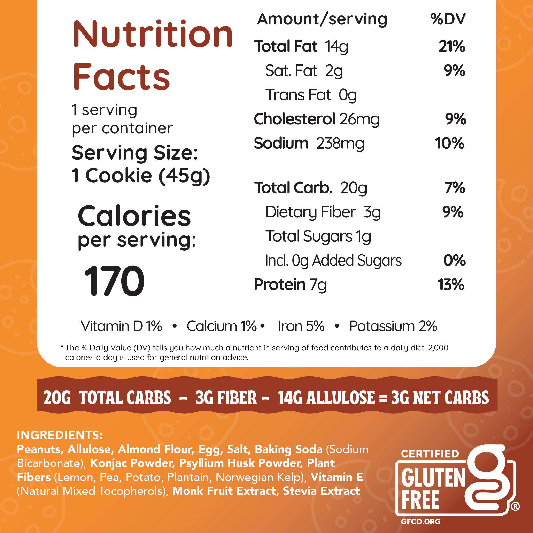 All of our cookies have 1-4 grams net carbs depending on the flavor while our bites are 1 gram net carb each. To calculate net carbs, subtract fiber and allulose from total carbs. Example: 1 cup of broccoli has 6g carbs and 2.4g fiber = 3.6 net carbs. Recommended net carbs on keto: 20g or less/day.