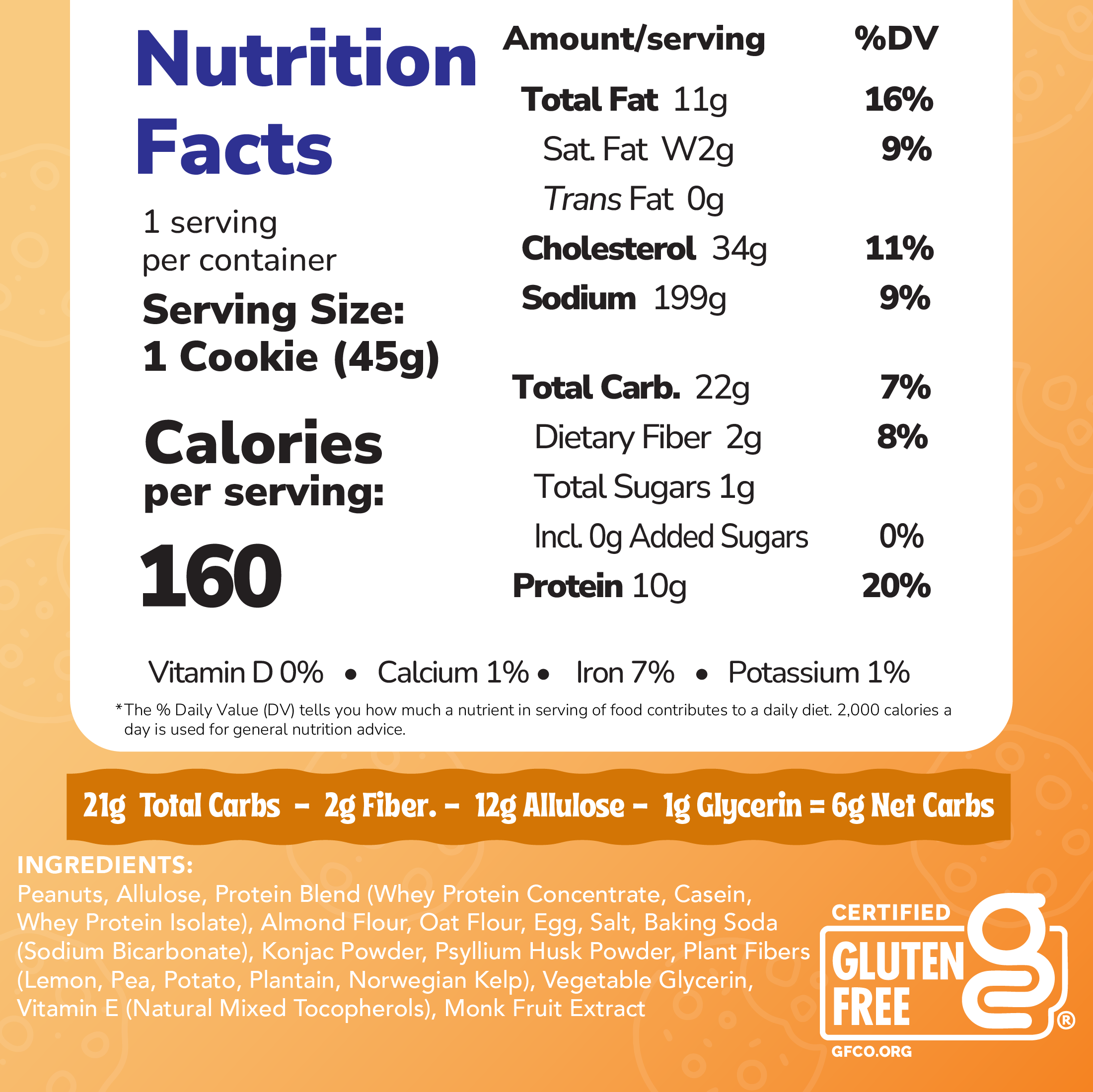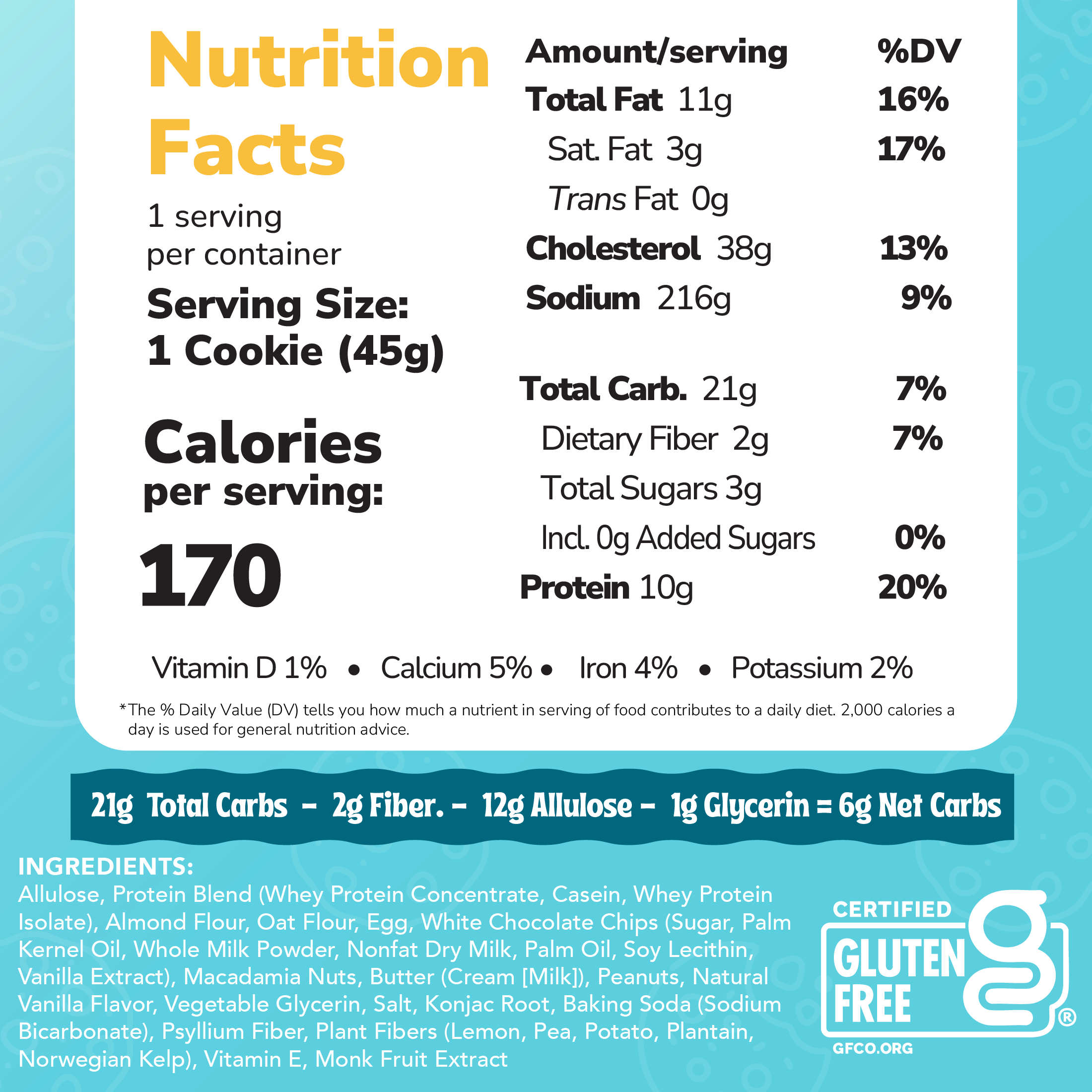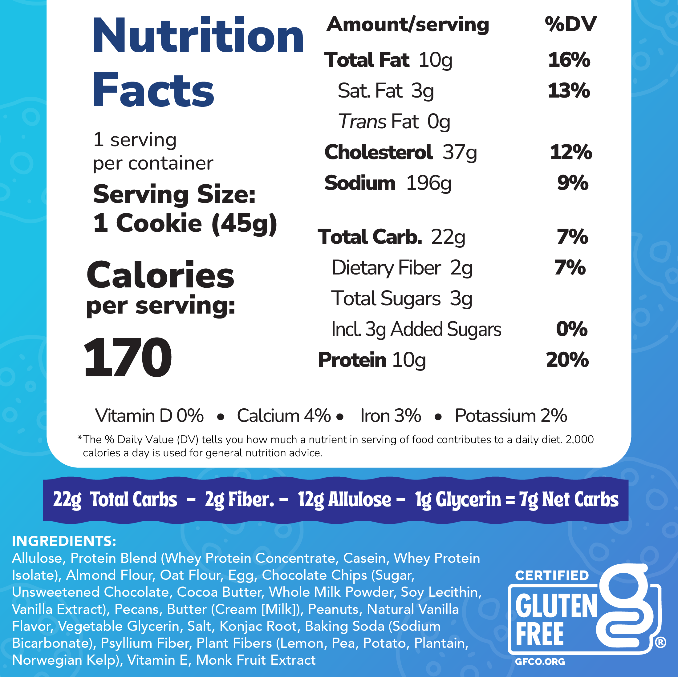10g protein and only 1-3g sugar, 4-7g net carbs, and 160-170 calories per 45g cookie (that's a big cookie!) Click here for our full ingredients and nutritional information.