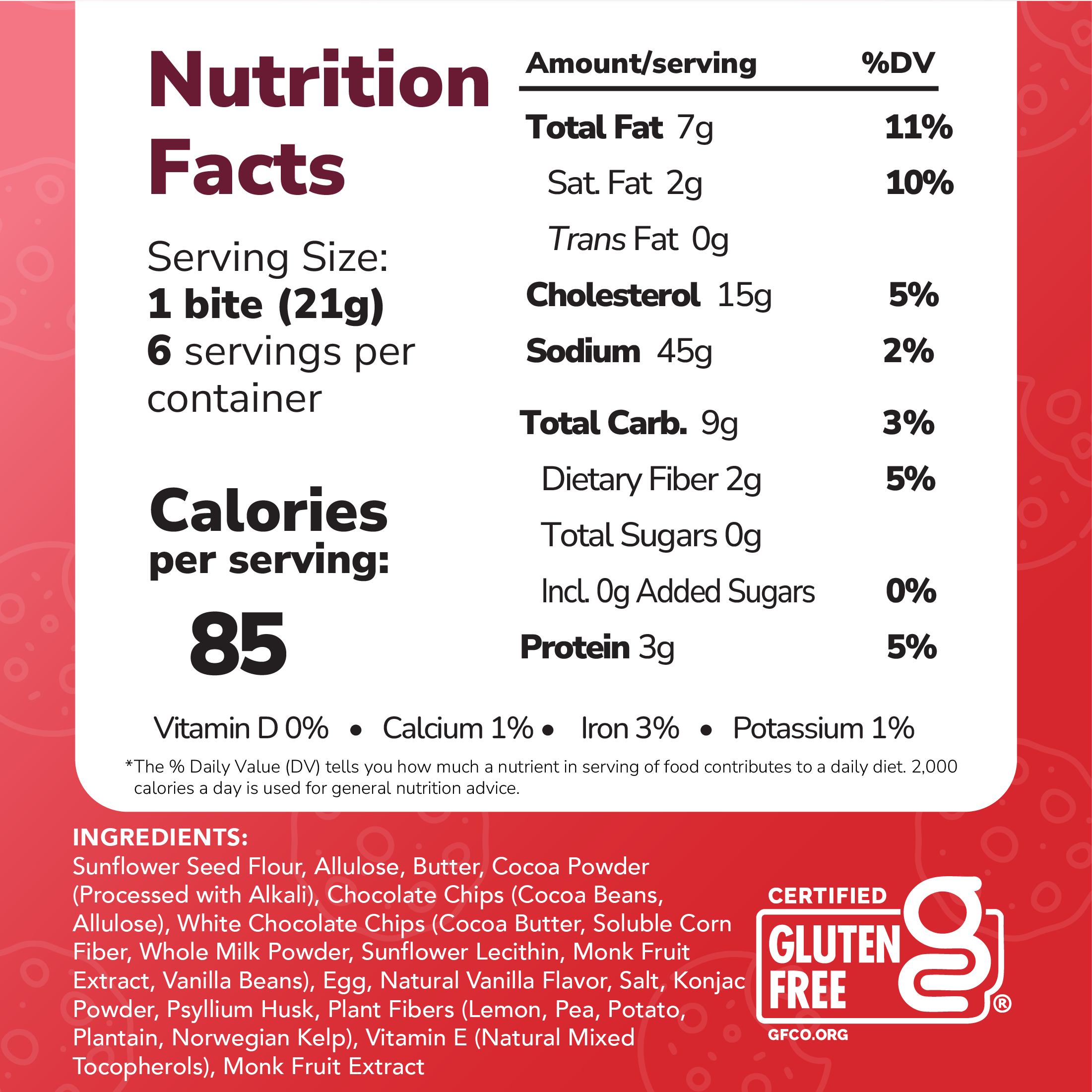 All of our cookies have 1-4 grams net carbs depending on the flavor while our bites are 1 gram net carb each. To calculate net carbs, subtract fiber and allulose from total carbs. Example: 1 cup of broccoli has 6g carbs and 2.4g fiber = 3.6 net carbs. Recommended net carbs on keto: 20g or less/day.
