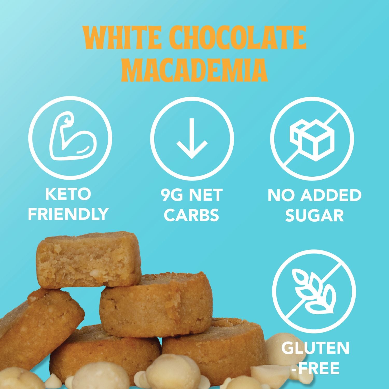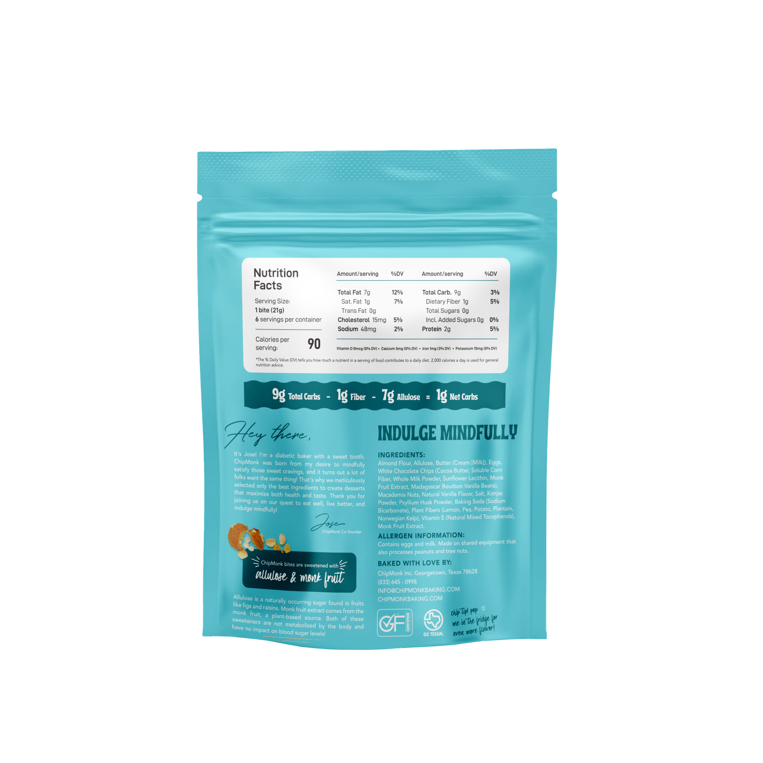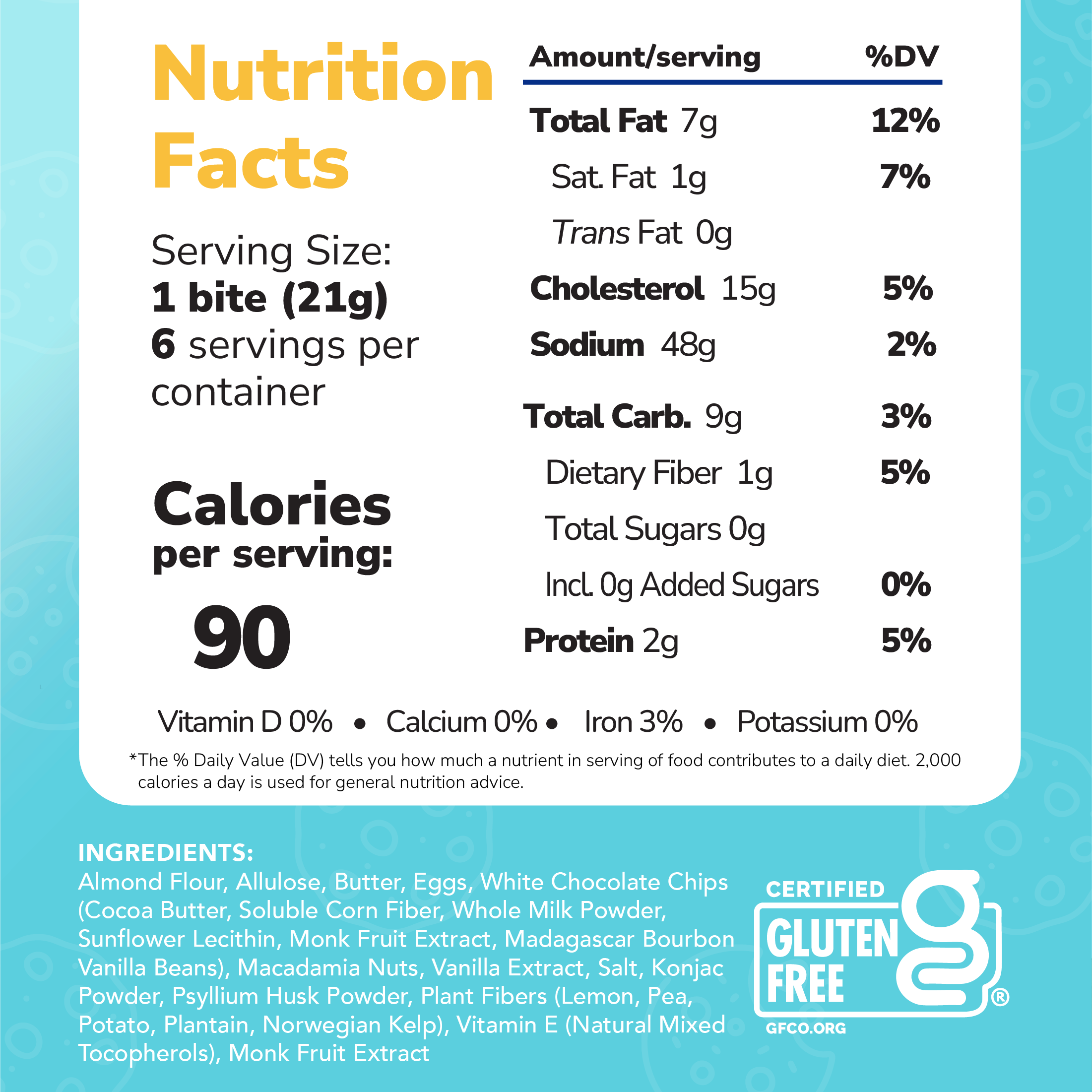 All of our cookies have 1-4 grams net carbs depending on the flavor while our bites are 1 gram net carb each. To calculate net carbs, subtract fiber and allulose from total carbs. Example: 1 cup of broccoli has 6g carbs and 2.4g fiber = 3.6 net carbs. Recommended net carbs on keto: 20g or less/day.