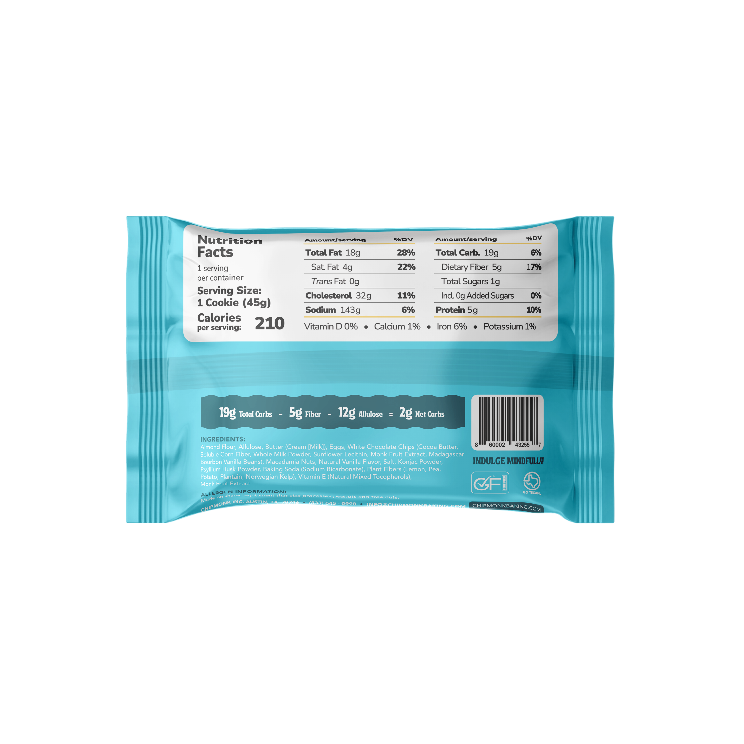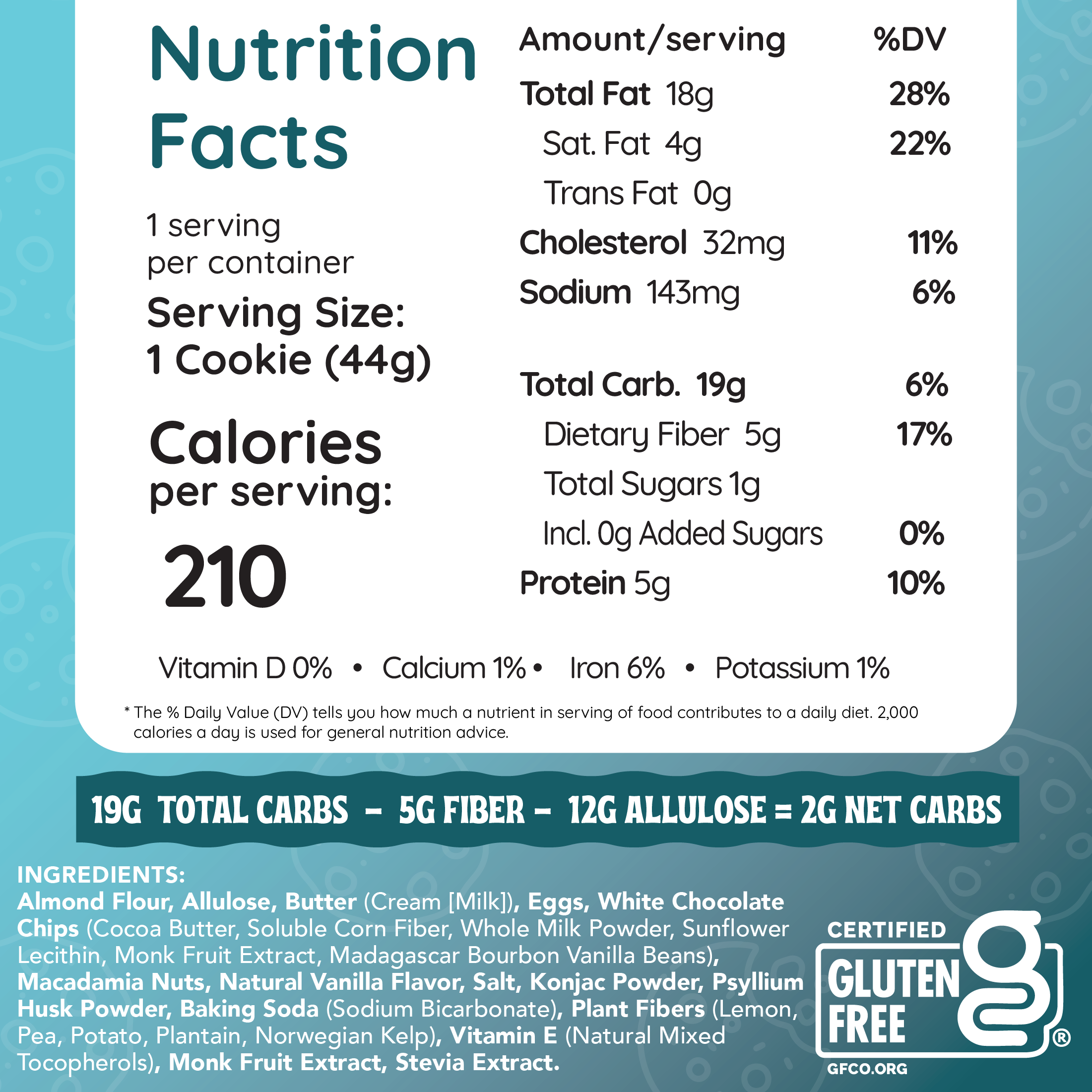 All of our cookies have 1-4 grams net carbs depending on the flavor while our bites are 1 gram net carb each. To calculate net carbs, subtract fiber and allulose from total carbs. Example: 1 cup of broccoli has 6g carbs and 2.4g fiber = 3.6 net carbs. Recommended net carbs on keto: 20g or less/day.